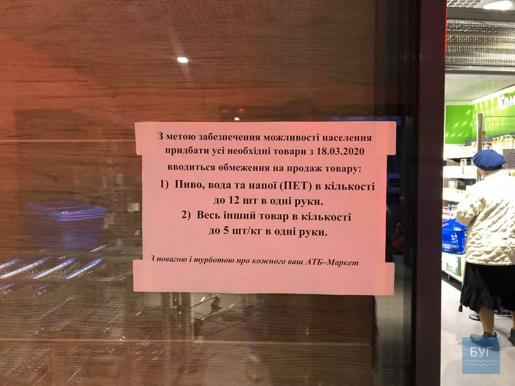 Мережа супермаркетів «АТБ» вводить обмеження на покупку товарів для однієї людини. Відповідне оголошення журналісти БУГу помітили в торговому закладі Нововолинська. "З метою забезпечення можливості населення придбати усі необхідні товари з 18.03.2020 вводиться обмеження на продаж товару: 1) Пиво, вода та напої в ...