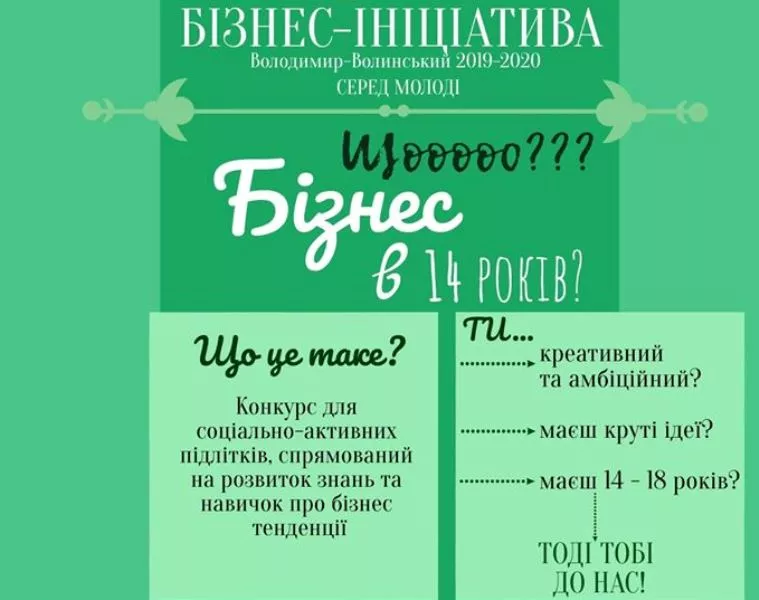 Із 3-го грудня по 31 січня 2019 року з метою популяризації підприємницької діяльності серед молодого покоління – жителів міста Володимира-Волинського віком від 14 до 18 років – у місті буде проведено конкурс “Бізнес-ініціатива серед молоді”. Про це повідомляють на сайті Володимира-Волинського. Завдання конкурсу: – ...