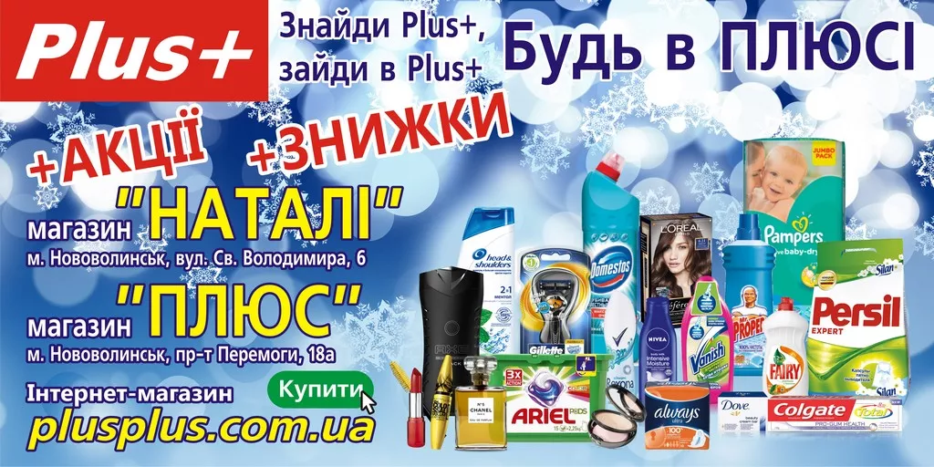 З нагоди новорічних свят магазини «Плюс» та «Наталі» надають знижку 10% кожному клієнту!!! Ми пропонуємо: побутову хімію, засоби особистої гігієни, товари для дому, засоби для бриття, дитячі підгузки, косметику, парфумерію та ін. Наші магазини пропонують: найкращу продукцію усіх цінових категорій; широкий асортимент