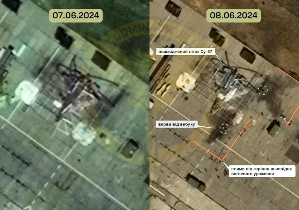 8-го червня на території аеродрому «Ахтубінск» в Астраханській області рф уражено багатоцільовий винищувач держави-агресора Су-57. На супутникових знімках видно, що 7-го червня Су-57 стоїть цілий, а вже 8-го червня біля нього зʼявились вирви від вибуху та характерні плями пожежі, що виникла внаслідок вогневого ...