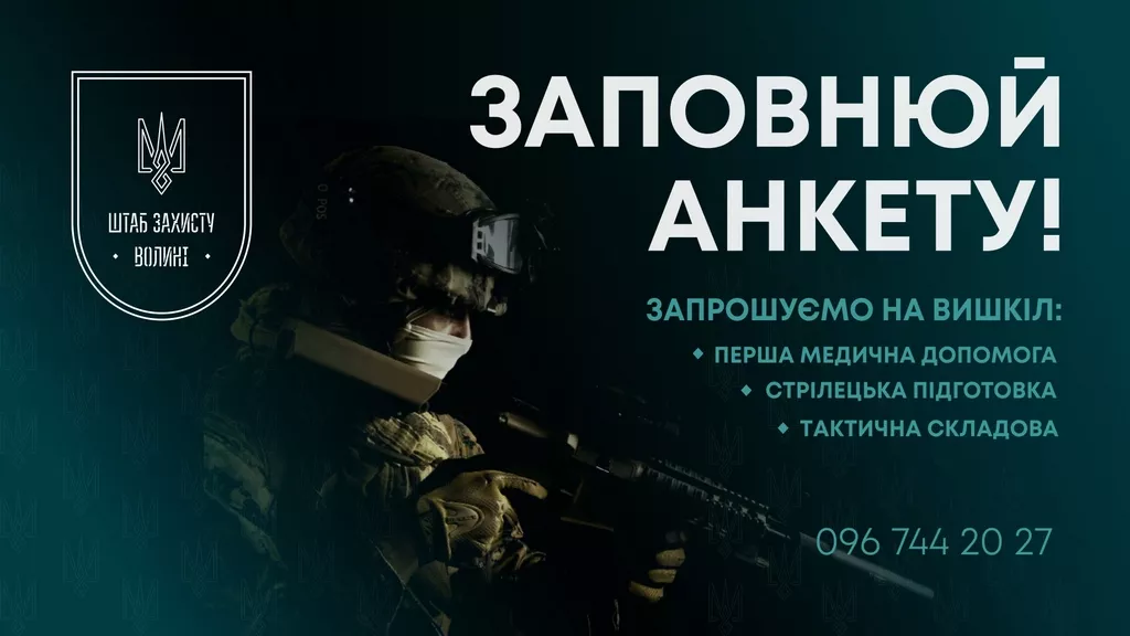 Штаб захисту Волині розпочинає зголошення учасників вишколів, що будуть містити курси: домедична допомога (тактична та цивільна); стрілецька підготовка; тактична складова; огляд і робота з спорядженням. Вишколи проводитимуться з метою підготовки волинян для того, щоб ми мали змогу захистити свою країну та рідних від ...