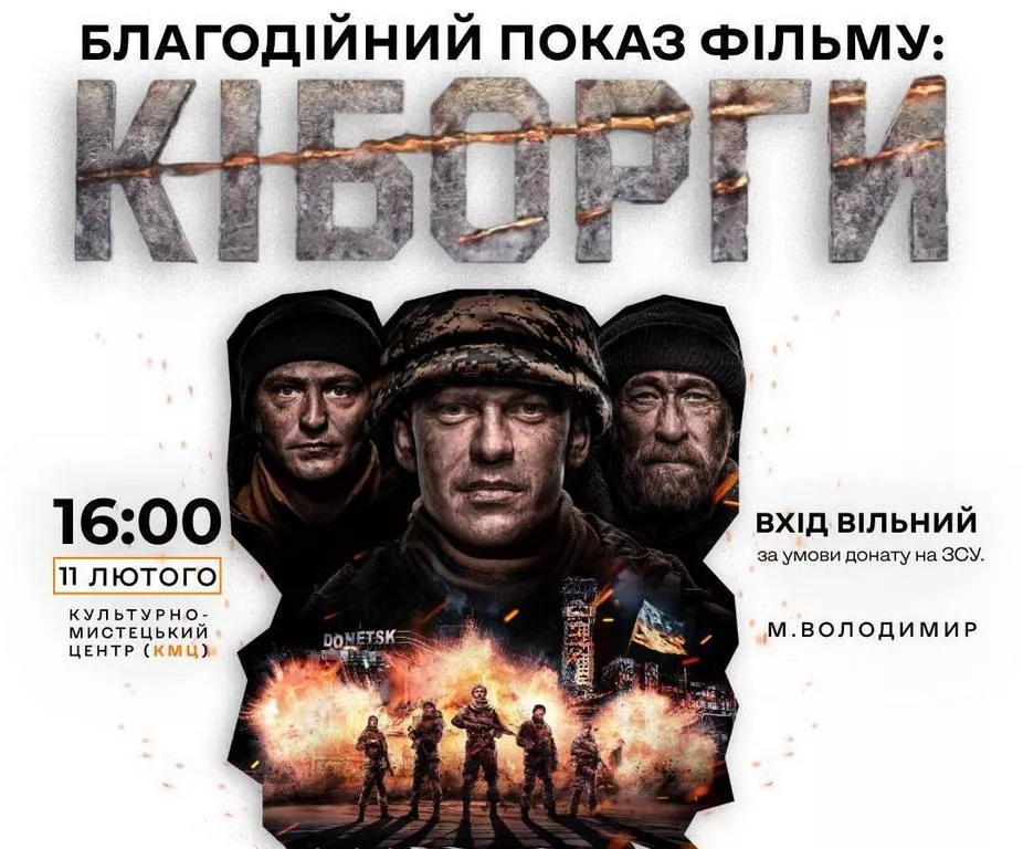 Володимирчан запрошують на благодійний кінопоказ у КМЦ Володимира (старий кінотеатр) о 16:00 в суботу 11-го лютого. До вашої уваги - «Кіборги. Герої не вмирають» Український повнометражний художній фільм режисера Ахтема Сеітаблаєва за сценарієм Наталії Ворожбит про бої в Донецькому аеропорту під час війни на Донбасі у ...