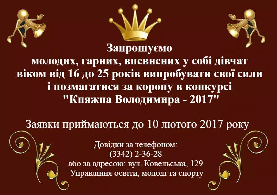 Управління освіти, молоді і спорту виконавчого комітету Володимир-Волинської міської ради анонсував щорічний конкурс "Княжна Володимира". До участі запрошуються молоді, красиві, впевнені у собі дівчата віком від 16 до 25 років. Це неабиякий шанс випробувати сили та позмагатися за корону Княжни, - зазначають ...