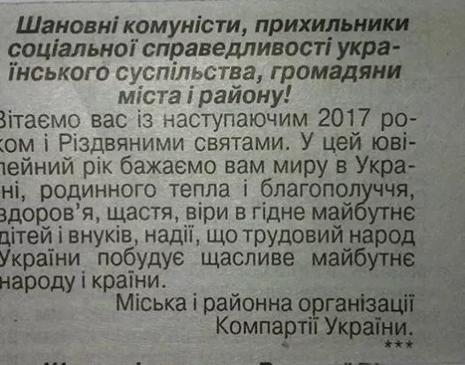 У Володимирі-Волинському у місцевій газеті вийшло вітання з Новим роком та Різдвом від Комуністичної партії, яка заборонена в Україні. Про це інформує власкор «Вголосу». Вітання вийшло напередодні новорічних свят і підписане: «Міська та районна організації Компартії України». ...