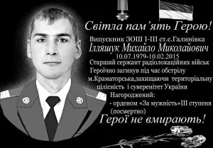 Меморіальну дошку відкрили вчора 10 лютого 2016 року на честь загиблого в Краматорську волинянина Михайла Ілляшука. Вчителі, учні, батьки та гості Галинівської загальноосвітньої школи тепер під час державних свят віддаватимуть данину світлій пам’яті її випускника, що посмертно нагороджений орденом «За мужність» 3-го ...