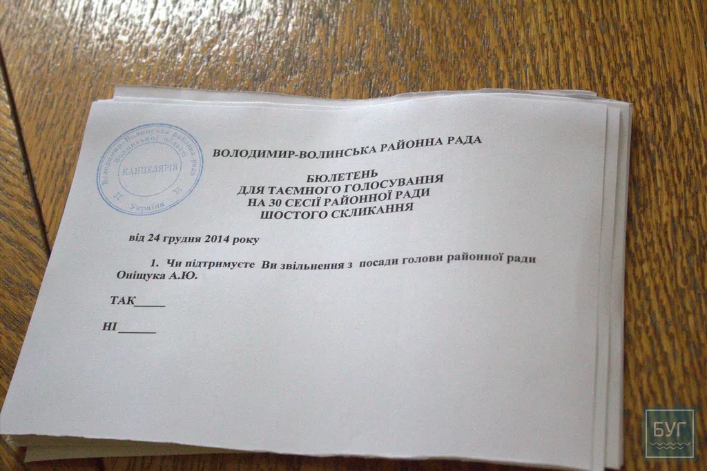 Депутати районної ради, після перерви, шляхом таємного голосування за зняття Андрія Оніщука із посади голови РДА, визначились таким чином: із 38 присутніх за зняття - 19, проти зняття - 18, 1 бюлетень не дійсний.  Рішення про зняття голови не прийнято, адже не набрано необхідних 50%+1 голос. Тому Оніщук ...