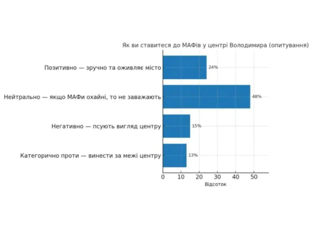 Мешканці Володимира не одностайні. Проте опитування засвідчило: більшість готова приймати МАФи за умови дотримання естетики та порядку. А кожен четвертий — узагалі бачить у них потенціал розвитку. Але близько 30% мешканців — проти: вони вважають, що центральна частина має зберігати свій автентичний вигляд.