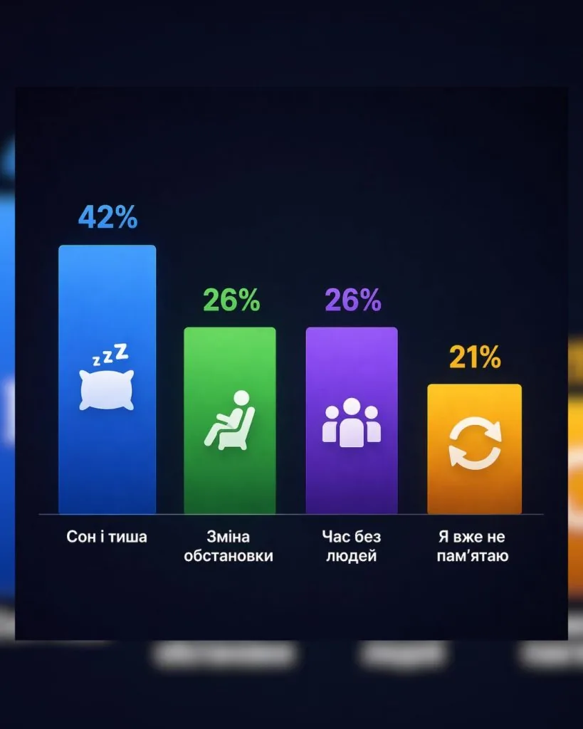 Результати показали досить показову картину. Найбільша частка опитаних — 42% — обрали варіант «сон і тиша», що свідчить про банальну, але важливу річ: більшість людей сьогодні просто не висипається. Ще 26% зазначили, що для них відпочинок — це зміна обстановки, і така ж кількість — час без людей. Водночас 21% зізналися, що вже навіть не пам’ятають, що таке відпочинок.