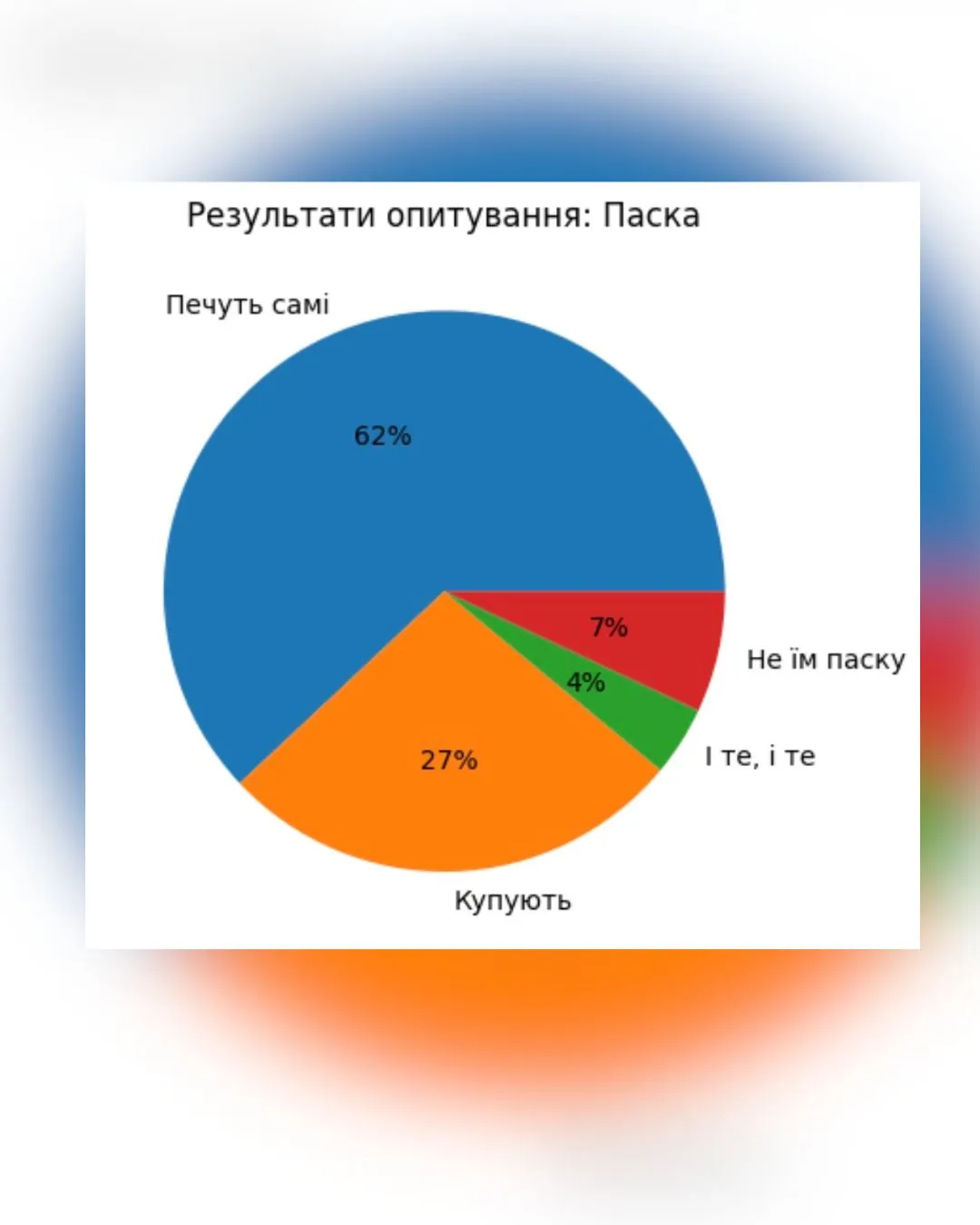 Водночас 27% відповіли, що купують паску, обираючи зручність і економію часу. Ще 4% поєднують обидва варіанти — і печуть, і купують. А 7% зазначили, що взагалі не вживають паску.